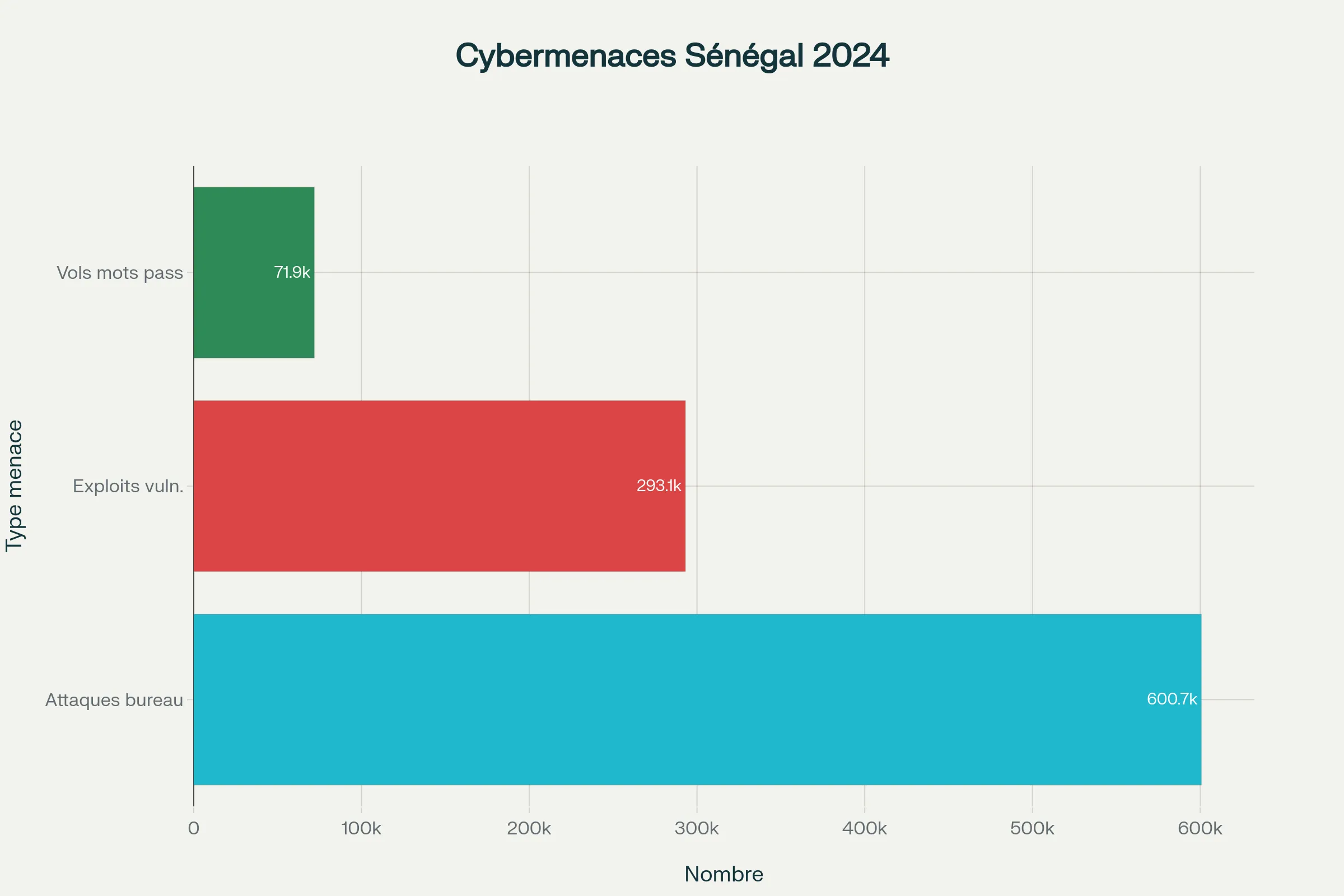 Les exploits de vulnérabilités représentent le deuxième vecteur d’attaque le plus fréquent avec 293,089 incidents recensés, témoignant des failles persistantes dans les systèmes informatiques des organisations sénégalaises. Les vols de mots de passe, bien que moins nombreux avec 71,852 cas, restent préoccupants par leur impact sur la confidentialité des données personnelles et professionnelles. Cette diversification des vecteurs d’attaque illustre l’évolution tactique des cybercriminels qui exploitent de manière systématique les vulnérabilités techniques et humaines.