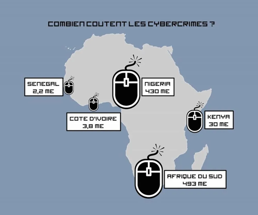 Carte montrant les coûts économiques estimés de la cybercriminalité en millions à travers les principaux pays africains, notamment le Sénégal, la Côte d’Ivoire, le Nigeria, le Kenya et l’Afrique du Sud.